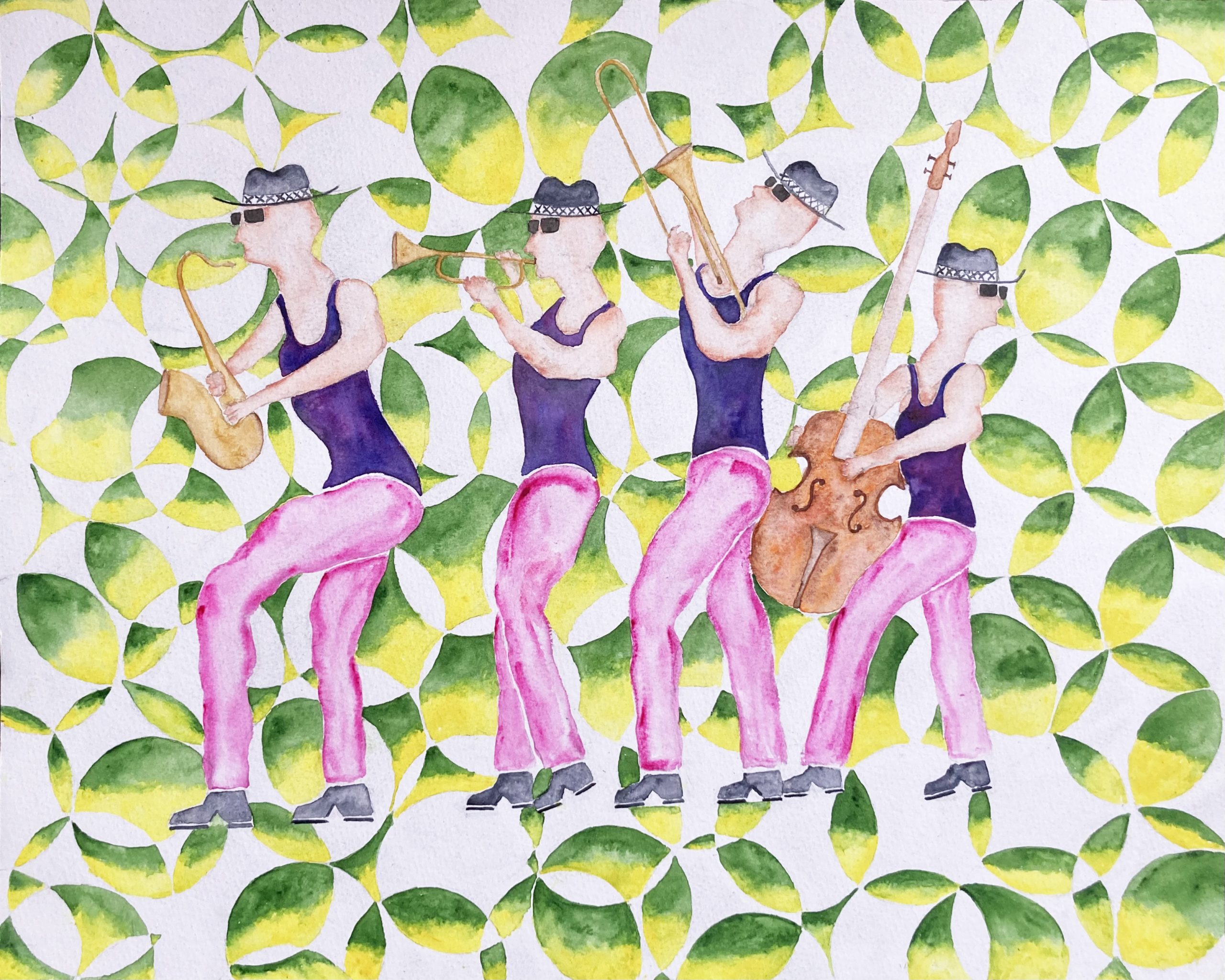 The art on these uniquely numbered collectable bottles is a reproduction of a watercolour called ‘Jazz in the Park’ by artist John Goldsworthy. A limited number of hand finished linoprints are available in our Art Shop.
